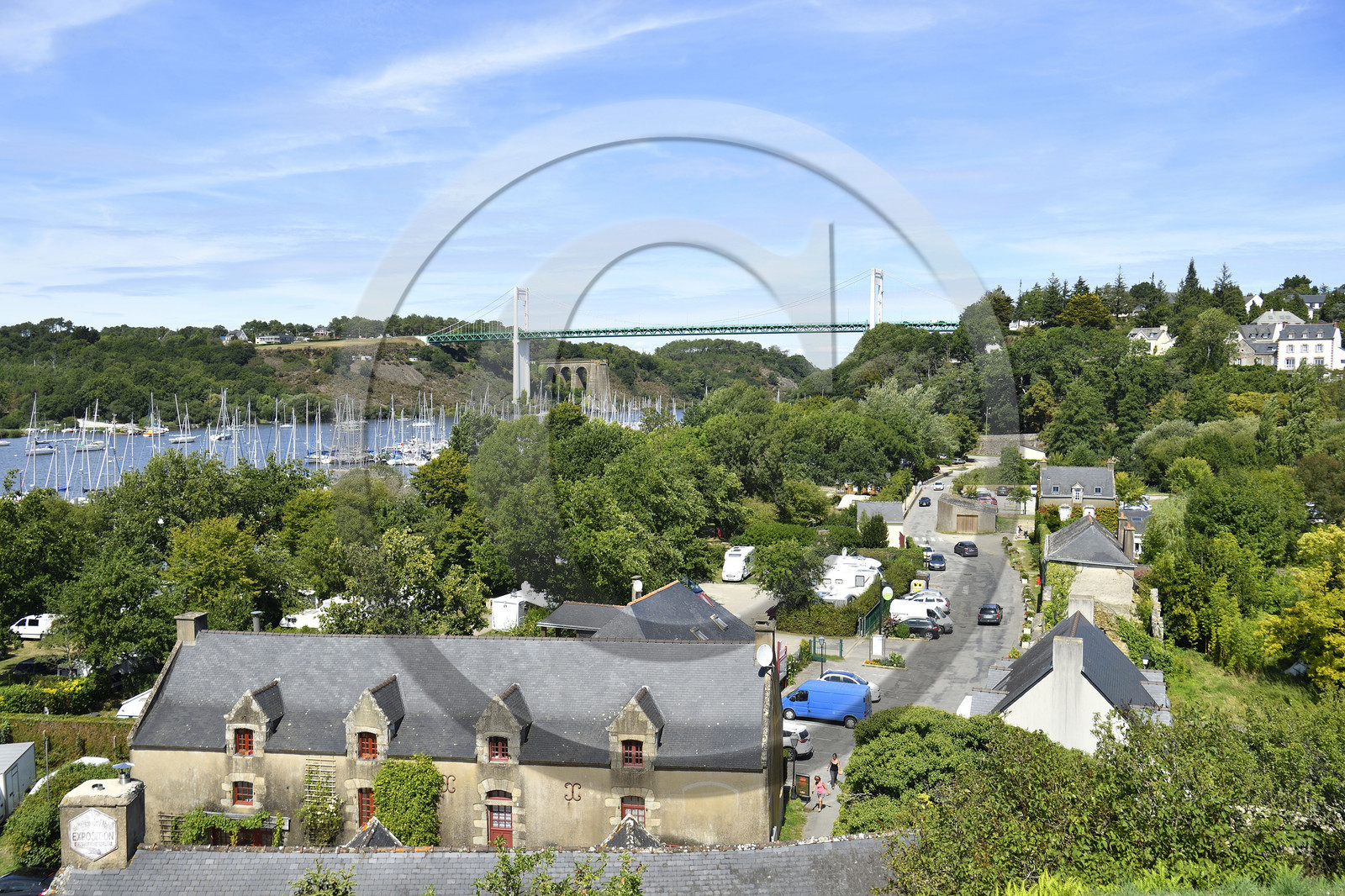 France, Morbihan (56), La Roche-Bernard, ville et le pont suspendu sur la Vilaine vu depuis le site du Rocher