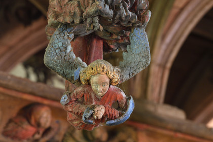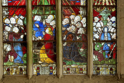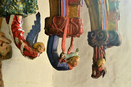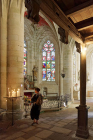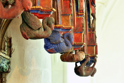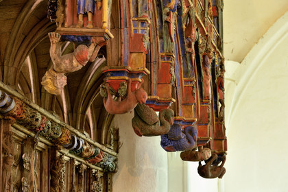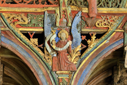 France, Morbihan (56), étape sur le chemin de Saint-Jacques de Compostelle, Le Faouët, chapelle Saint-Fiacre du XVe siècle, le jubé polychrome en bois considéré comme l'un des plus beaux de France