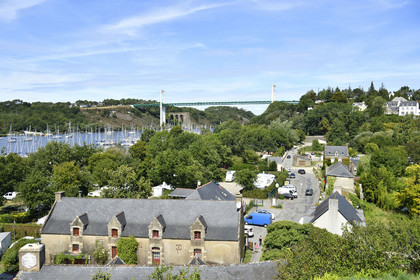 France, Morbihan (56), La Roche-Bernard, ville et le pont suspendu sur la Vilaine vu depuis le site du Rocher