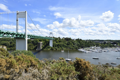 France, Morbihan (56), La Roche-Bernard, le pont suspendu sur la Vilaine et le port de plaisance